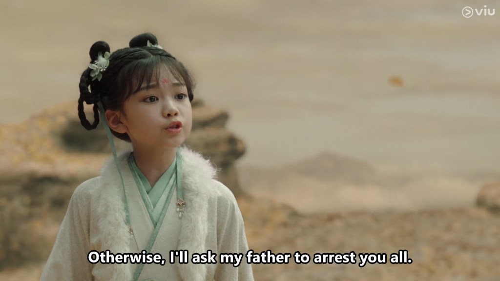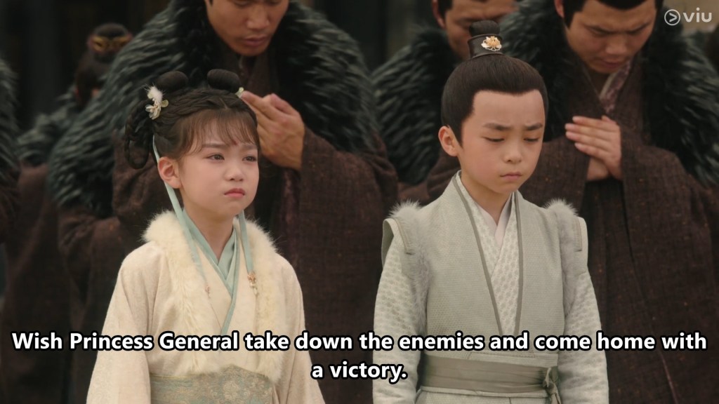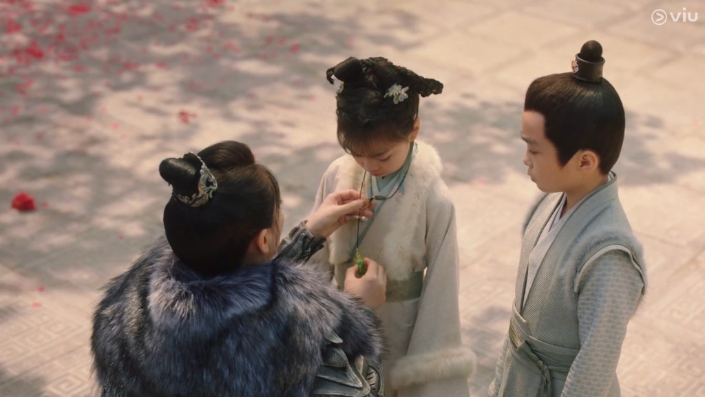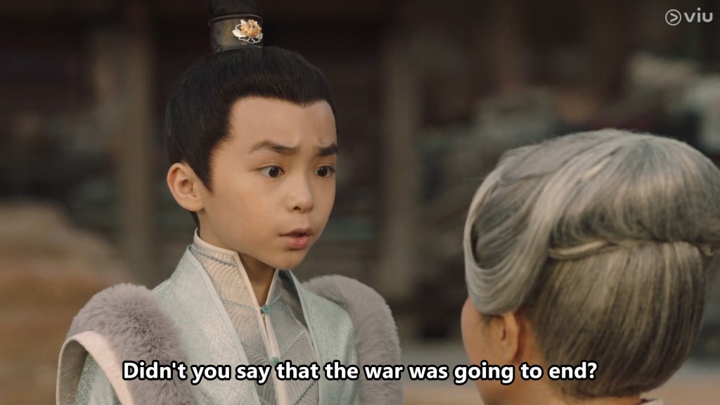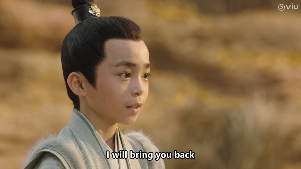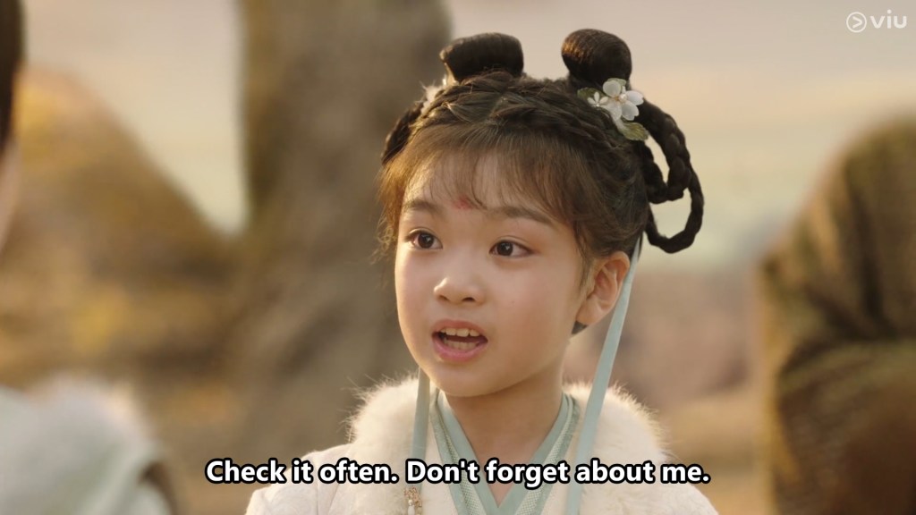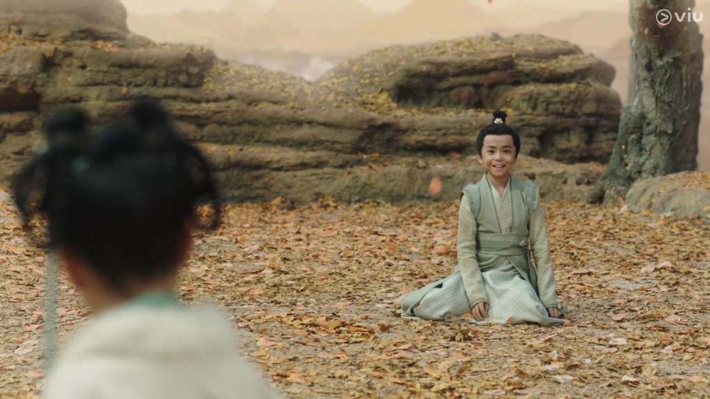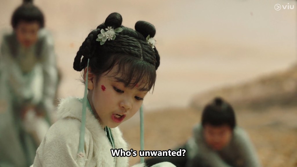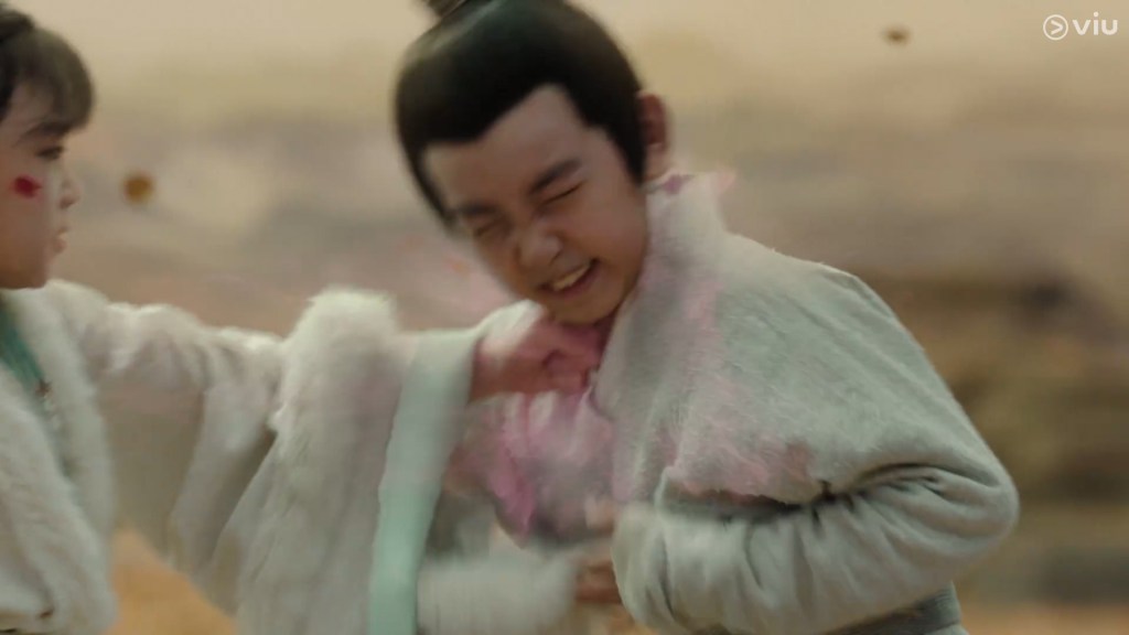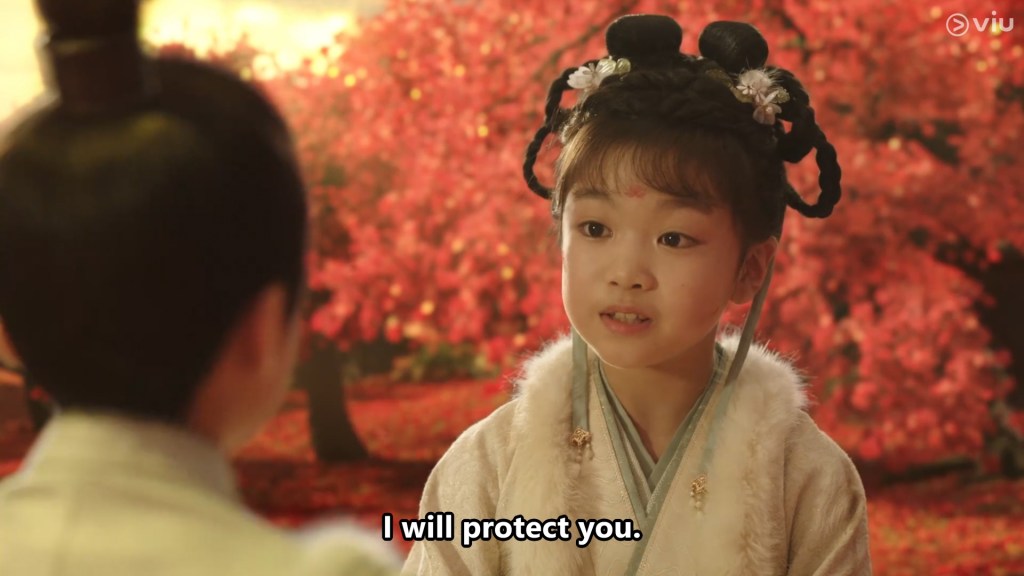 The girl has a little flower mark on her forehead and appears to be bright, confident and cheeky. She called the boy Cang Xuan, and after some playful bickering and dialogue, we learn that young Cang Xuan’s parents are away fighting a war.