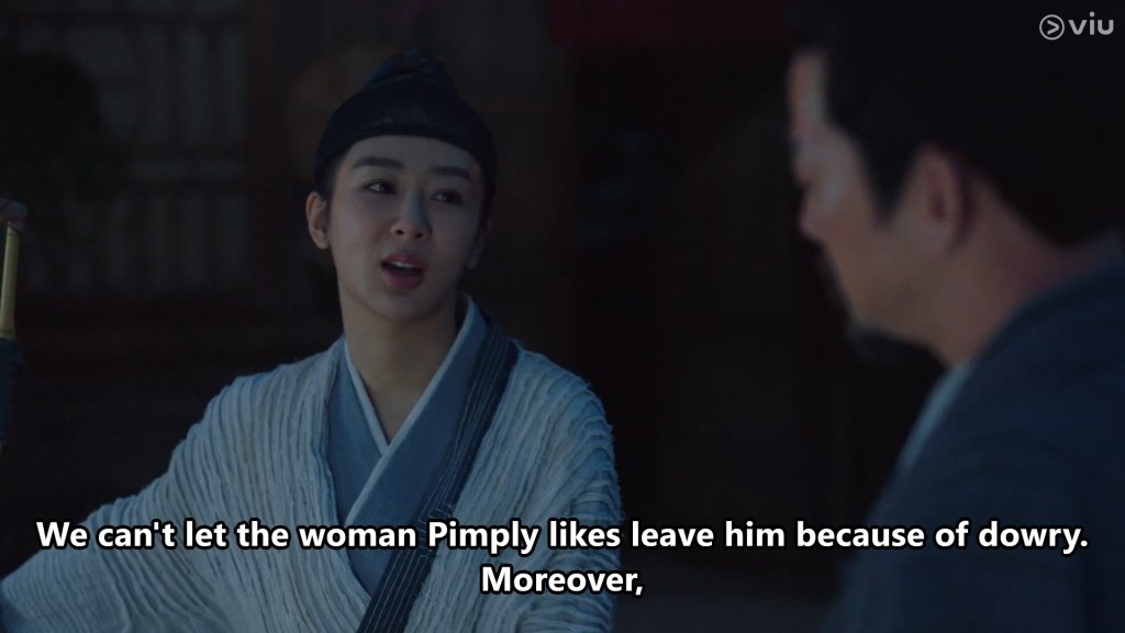 Her face is troubled when she overhears how Pimply can’t make his dowry. Skinny takes him out for drinks to drown his sorrows.
