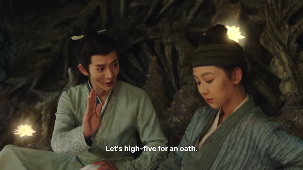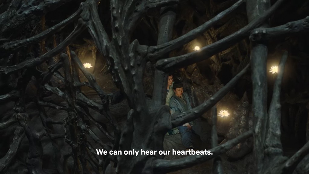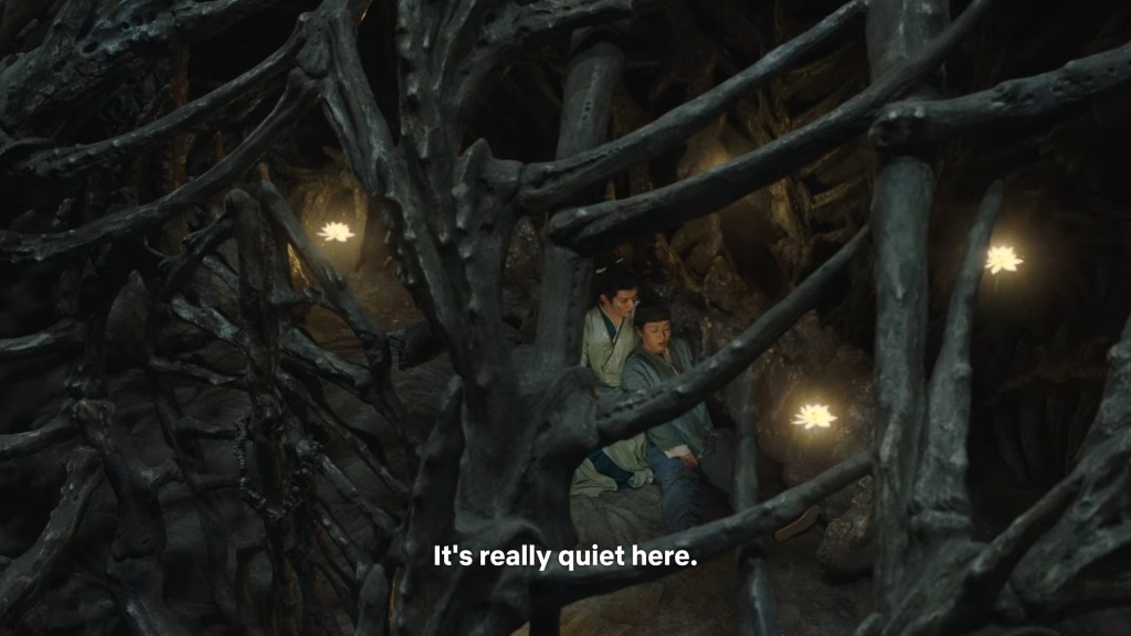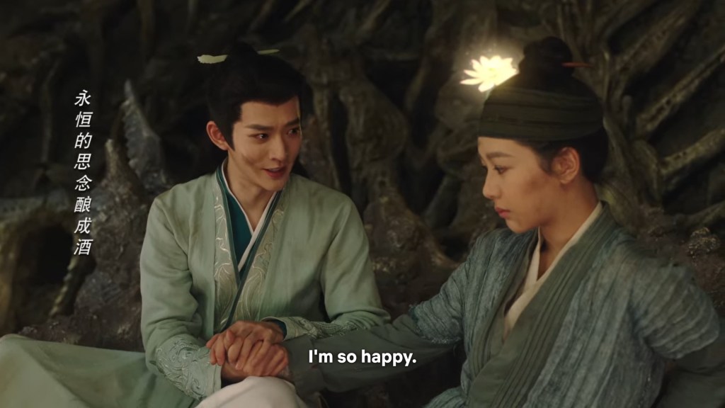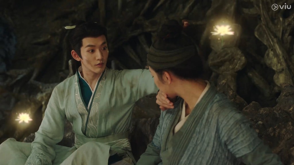 In the novel the two of them were in darkness, but we can’t have the characters talking in the dark for a long time in the drama, so Jing used his spiritual power to light some romantic ambience lighting.