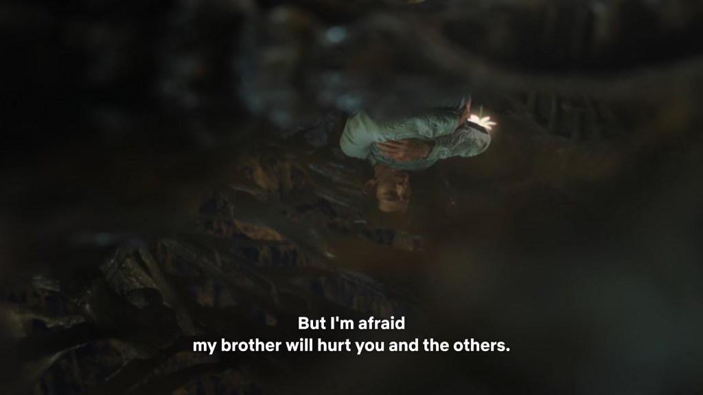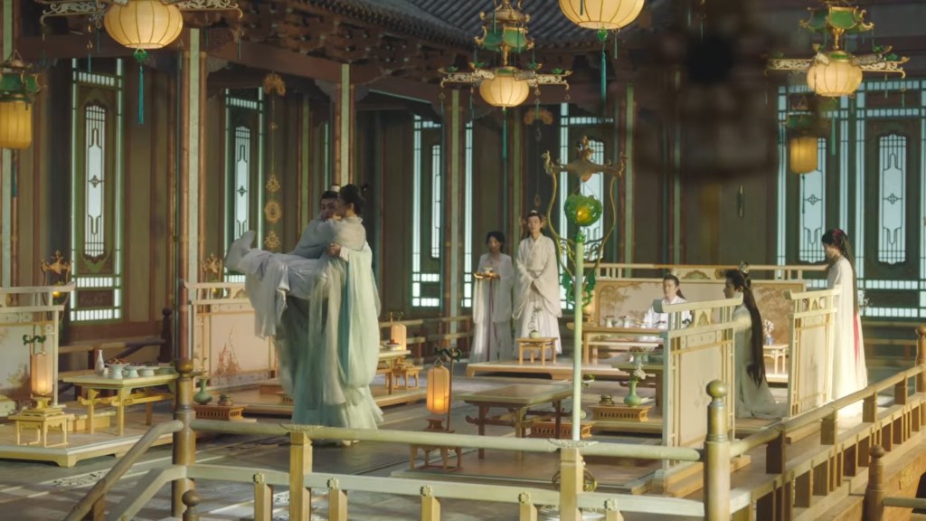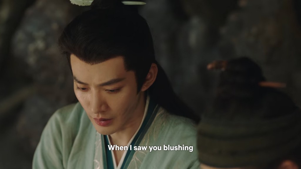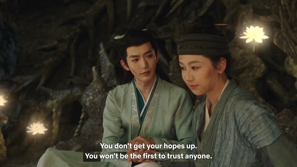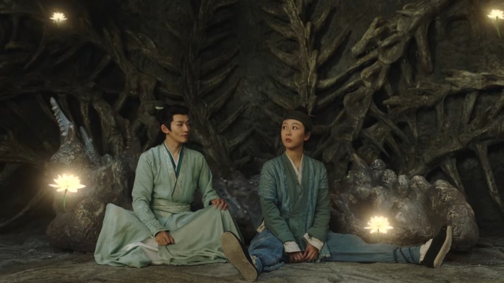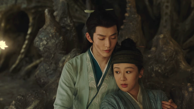 In the novel the two of them were in darkness, but we can’t have the characters talking in the dark for a long time in the drama, so Jing used his spiritual power to light some romantic ambience lighting.