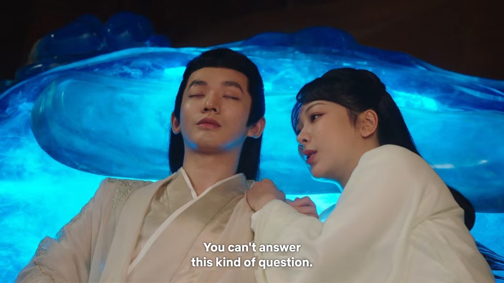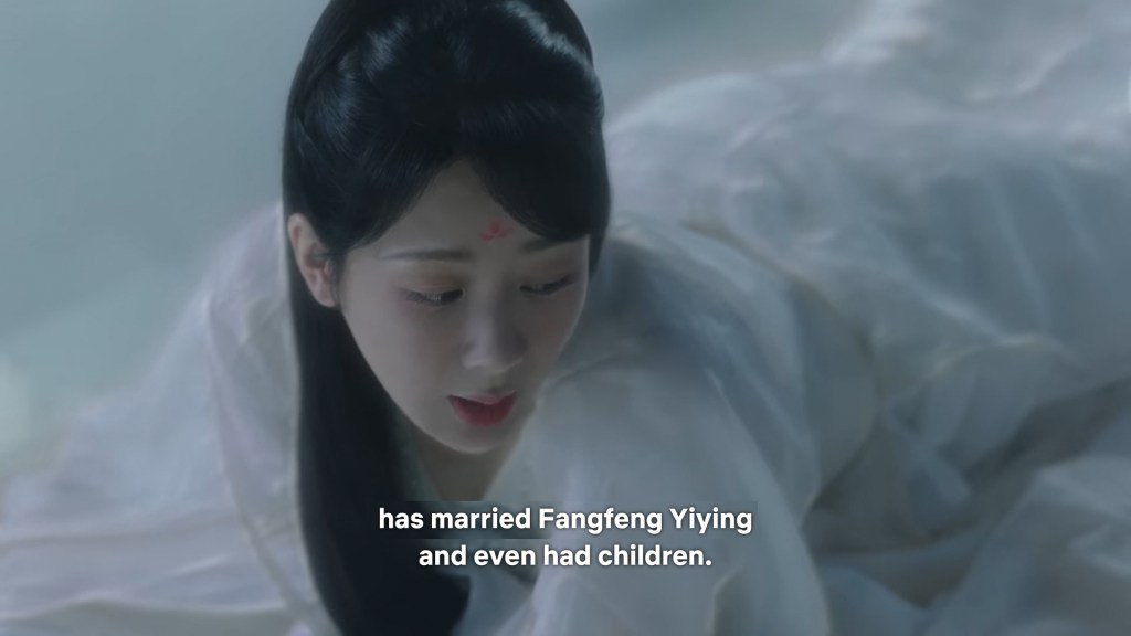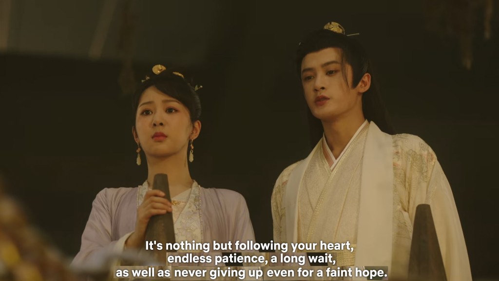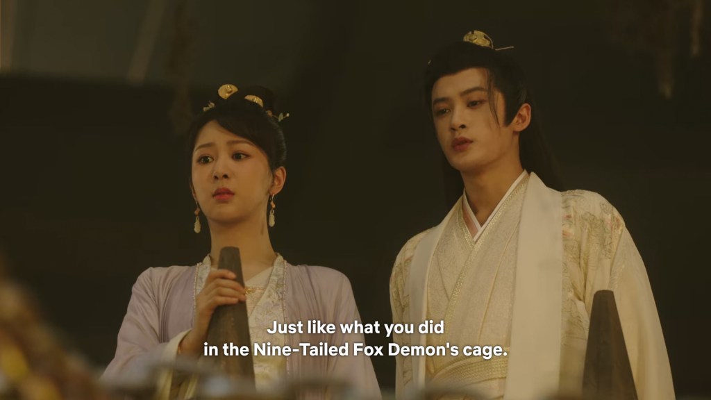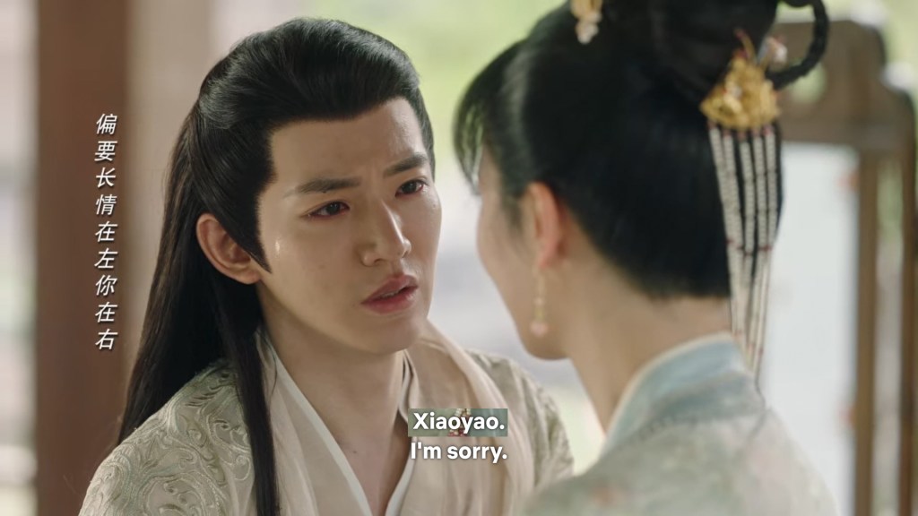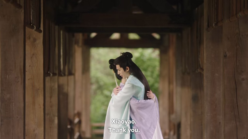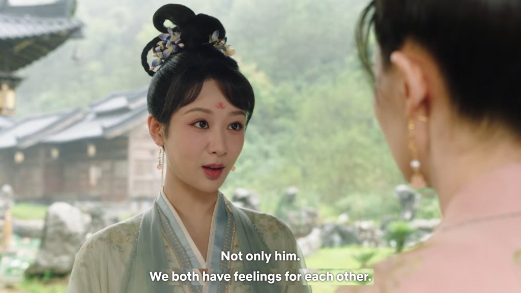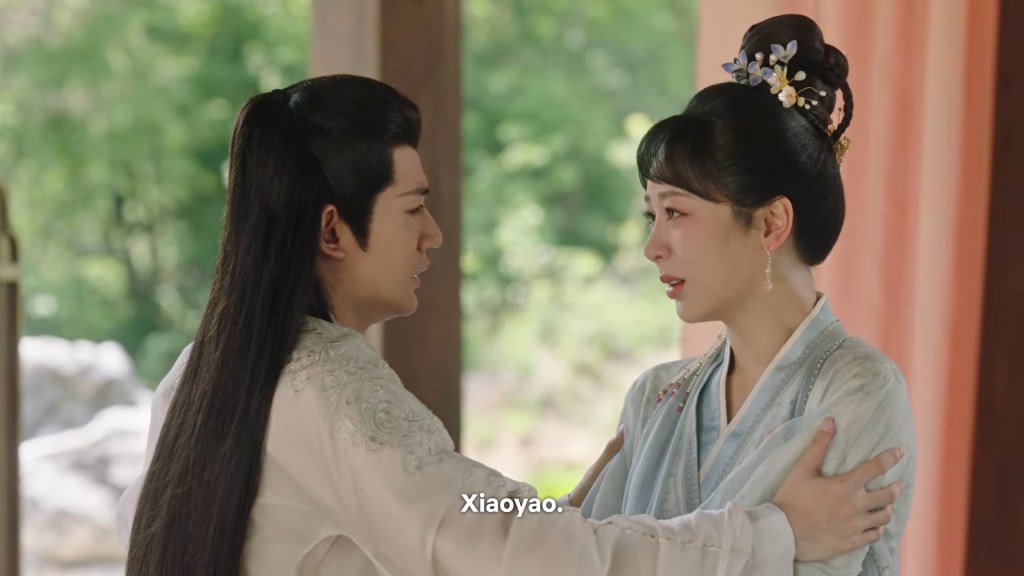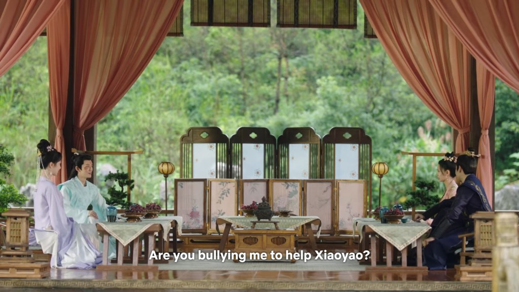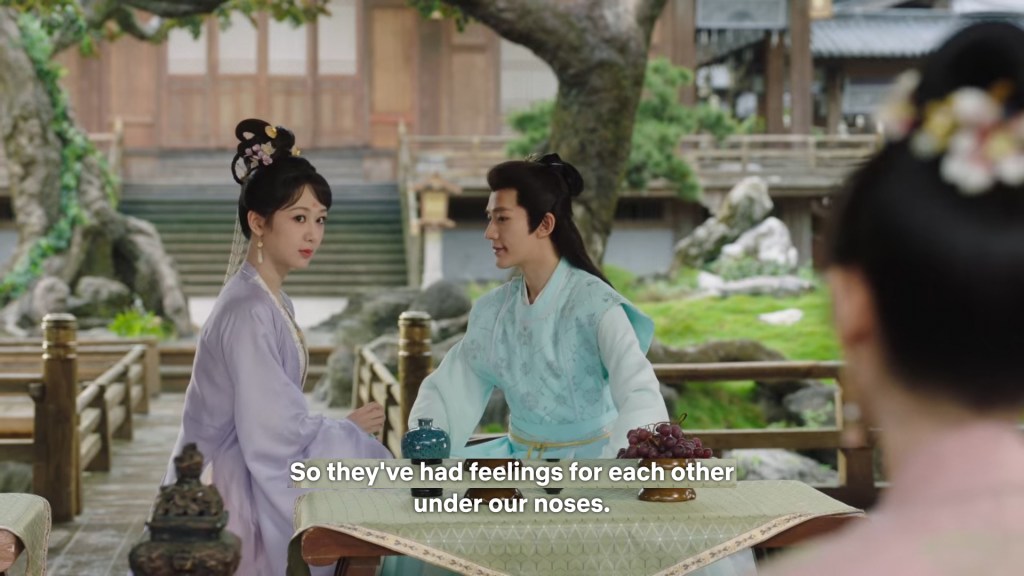 Xinyue asked Jing and Xiaoyao to sit down and as they did, Xinyue felt the scene before her very familiar, something suddenly clicked and she smiled at Fenglong “These two, had feelings for each other right under our noses. No wonder that day Xiaoyao’s song was appealing and full of affection.”