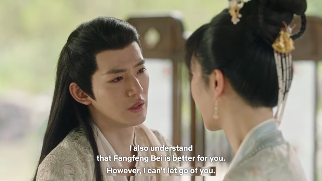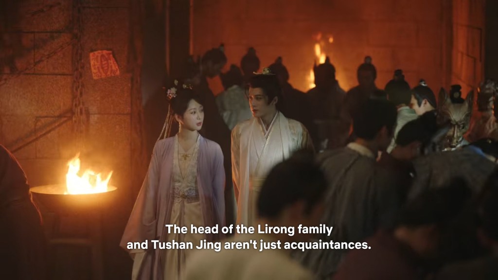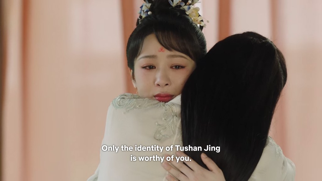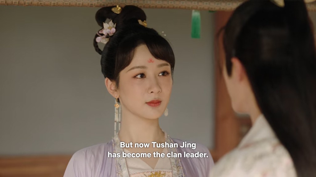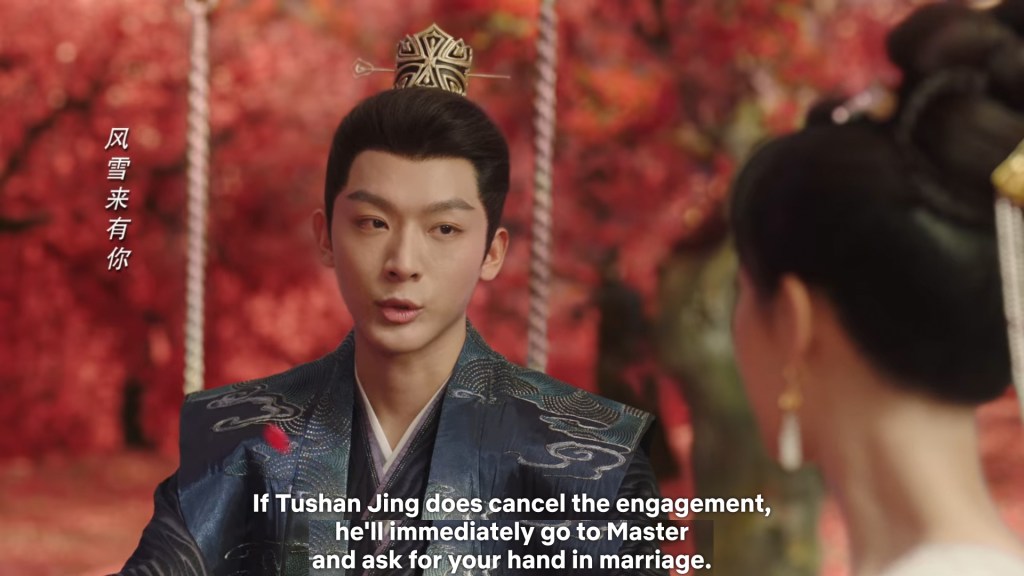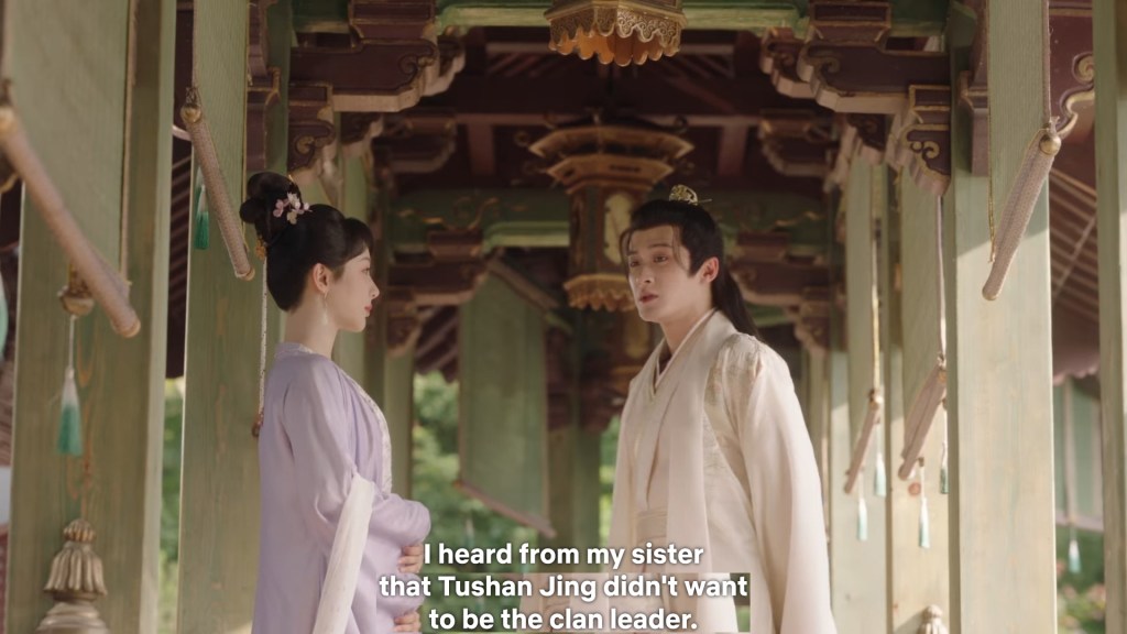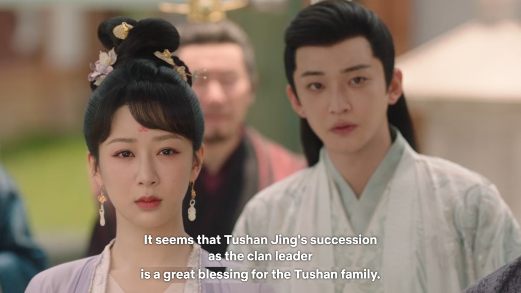 Fangfeng Bei said ” I heard from my sister that Jing did not want to become the clan leader. He had knelt in front of the Grand Madam’s room for a whole day to cancel his engagement. If he really won’t become the clan leader, knowing my sister, she would have found a decent way to cancel the engagement. But now Tushan Jing is the clan leader, her years of hope is right before her, she won’t give this up.”