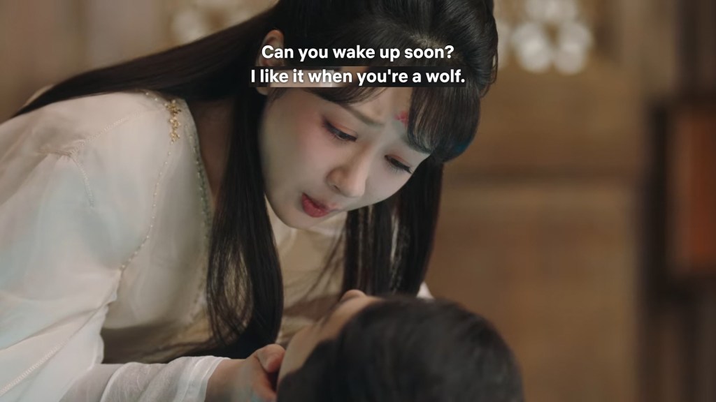 Jing is still very pale but Xiaoyao’s cheeks were flushed red as she lied down on Jing’s shoulder and said in a low voice “Can you wake up soon? I like it when you are the wolf.”