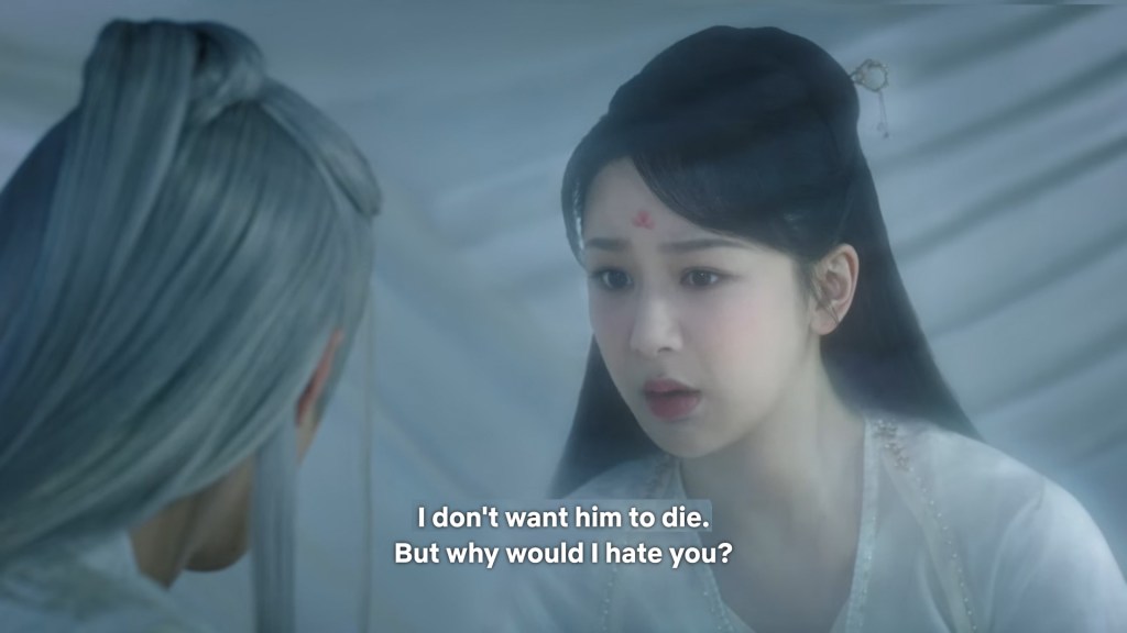 It would seem from the moment Hong Jiang is mentioned in the story, his moons with Xiaoyao are no longer full moons. In a poetic way, Xiangliu’s love for Xiaoyao is like the full moons where he heals her at the peak of his powers, but she will never see it.