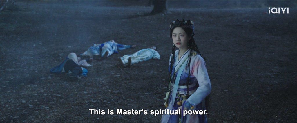 Facing the spell of Dun Tian’s demonized wife ( also not in the novel ) forced the cowardly Mu Ranwu to break their lock and finally give up what she stole. How convenient that the spell attacks the ones with the stronger spiritual powers.